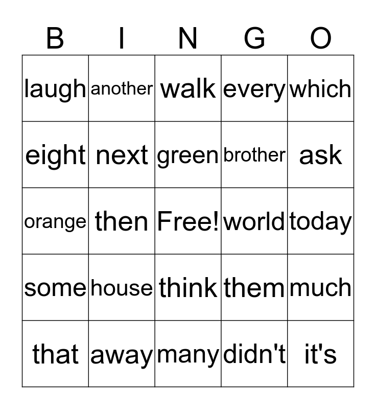 This bingo card has a free space and 24 words: house, away, green, that, which, laugh, eight, another, world, think, brother, orange, them, much, next, didn't, today, walk, ask, then, it's, some, every and many.