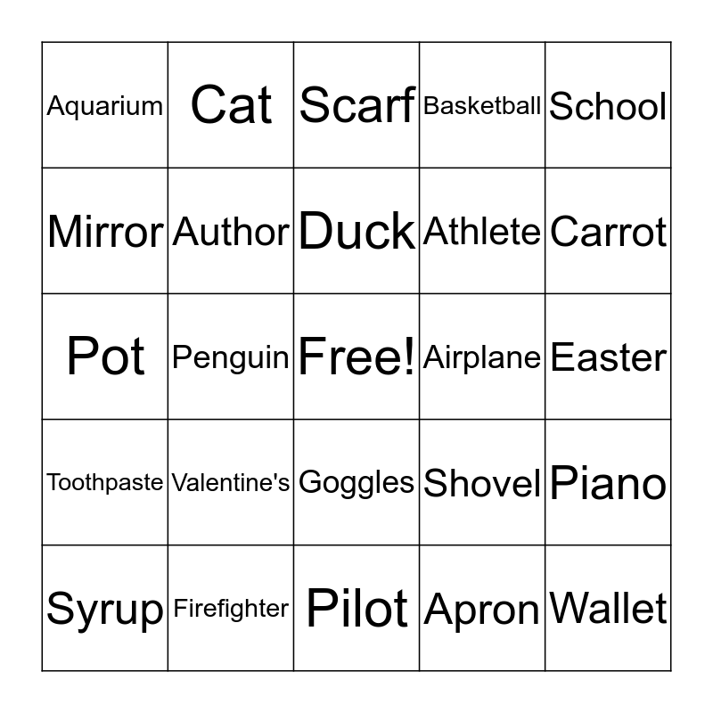 This bingo card has a free space and 26 words: Goggles, Apron, Duck, Firefighter, School, Aquarium, Mirror, Cat, Easter, Shovel, Athlete, Pot, Piano, Syrup, Penguin, Ring, Basketball, Toothpaste, Scarf, Wallet, Carrot, Pilot, Airplane, Valentine's, Author and Halloween.