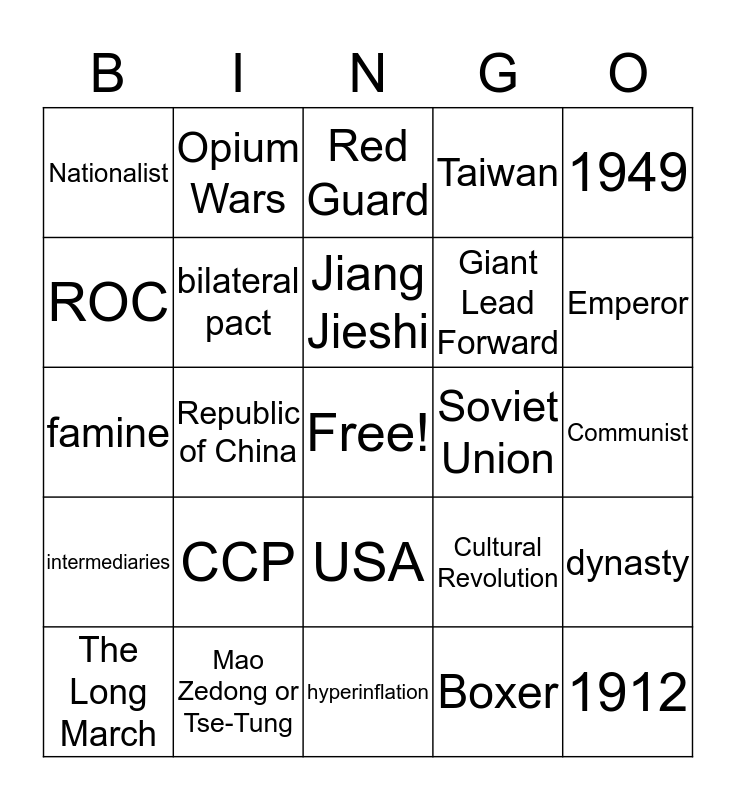 This bingo card has a free space and 24 words: CCP, Mao Zedong or Tse-Tung, Jiang Jieshi, The Long March, 1949, Nationalist, ROC, Opium Wars, Soviet Union, USA, Giant Lead Forward, famine, Cultural Revolution, dynasty, bilateral pact, Boxer, Communist, Red Guard, Emperor, Republic of China, 1912, intermediaries, Taiwan and hyperinflation.