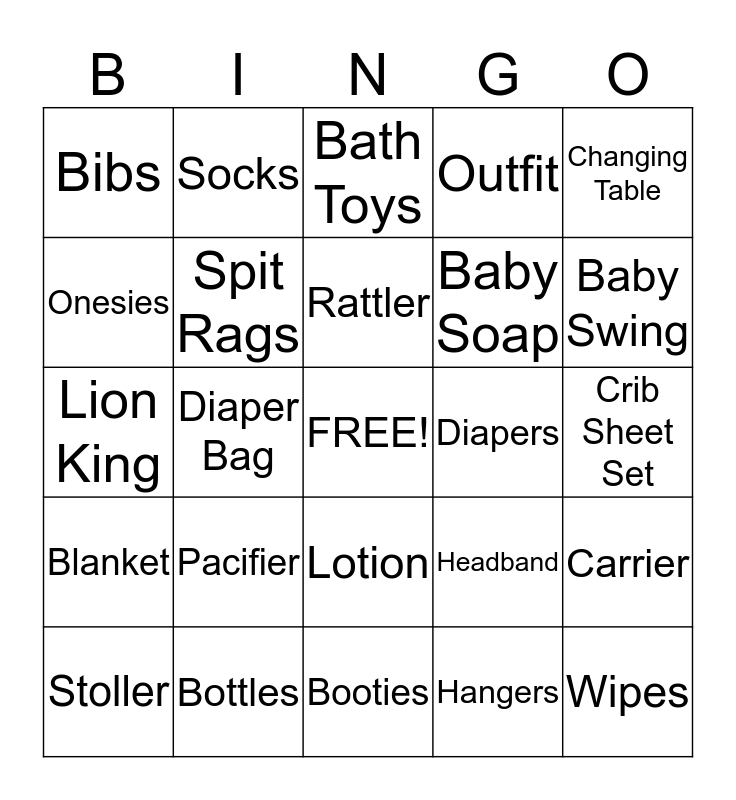 This bingo card has a free space and 24 words: Pacifier, Bottles, Rattler, Stoller, Changing Table, Bibs, Onesies, Socks, Diapers, Lotion, Baby Soap, Lion King, Headband, Carrier, Spit Rags, Hangers, Crib Sheet Set, Bath Toys, Baby Swing, Diaper Bag, Wipes, Blanket, Outfit and Booties.