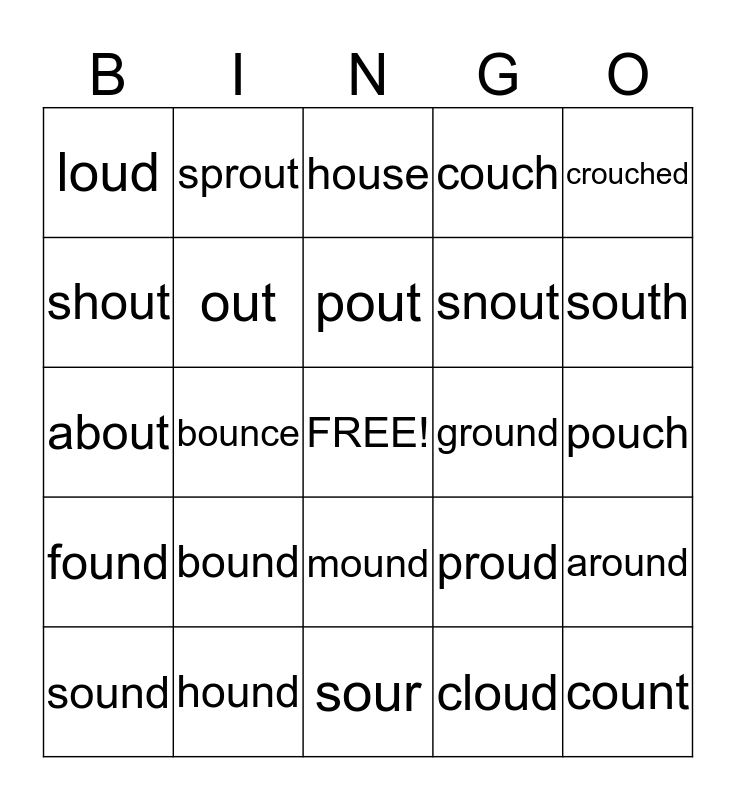 This bingo card has a free space and 24 words: bound, hound, pout, sound, crouched, loud, shout, sprout, ground, mound, snout, about, proud, around, out, cloud, pouch, house, south, bounce, count, found, couch and sour.