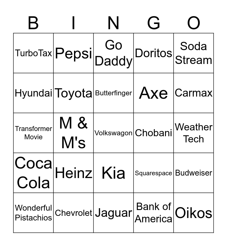 This bingo card has a free space and 28 words: Budweiser, Audi, Axe, Bank of America, Hyundai, Go Daddy, Pepsi, Coca Cola, Chobani, Wonderful Pistachios, Transformer Movie, Doritos, Chevrolet, Jaguar, Carmax, Go Daddy, Heinz, Toyota, Butterfinger, Kia, TurboTax, H & M, Oikos, M & M's, Weather Tech, Squarespace, Soda Stream and Intuit.