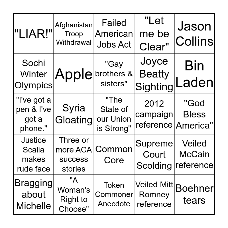 This bingo card has a free space and 24 words: Three or more ACA success stories, "A Woman's Right to Choose", "Gay brothers & sisters", Bragging about Michelle, Jason Collins, "LIAR!", Sochi Winter Olympics, Afghanistan Troop Withdrawal, 2012 campaign reference, Common Core, Joyce Beatty Sighting, "I've got a pen & I've got a phone.", Supreme Court Scolding, Veiled McCain reference, Apple, Veiled Mitt Romney reference, "God Bless America", Failed American Jobs Act, Bin Laden, Syria Gloating, Boehner tears, Justice Scalia makes rude face, "Let me be Clear" and Token Commoner Anecdote.