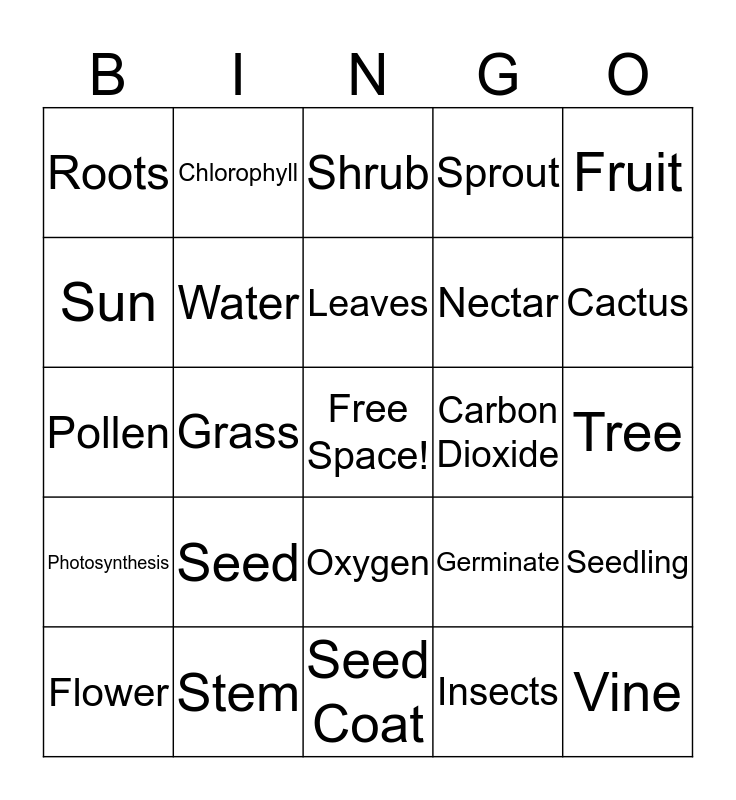 This bingo card has a free space and 24 words: Seed, Stem, Leaves, Flower, Fruit, Roots, Sun, Chlorophyll, Carbon Dioxide, Oxygen, Nectar, Pollen, Germinate, Seedling, Water, Insects, Tree, Shrub, Cactus, Grass, Vine, Photosynthesis, Sprout and Seed Coat.