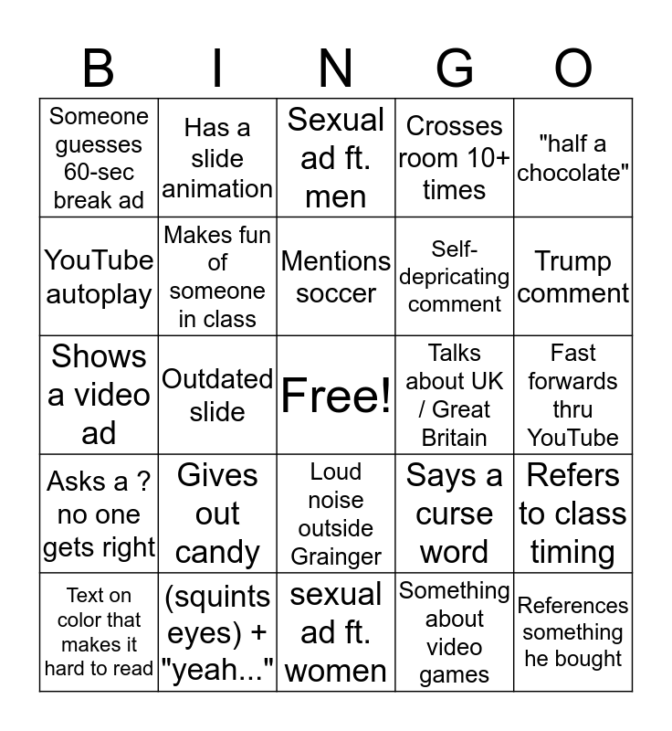 This bingo card has a free space and 24 words: Gives out candy, (squints eyes) + "yeah...", Mentions soccer, Text on color that makes it hard to read, "half a chocolate", Someone guesses 60-sec break ad, YouTube autoplay, Has a slide animation, Talks about UK / Great Britain, Loud noise outside Grainger, Self-depricating comment, Shows a video ad, Says a curse word, Refers to class timing, Makes fun of someone in class, Something about video games, Fast forwards thru YouTube, Sexual ad ft. men, Trump comment, Outdated slide, References something he bought, Asks a ? no one gets right, Crosses room 10+ times and sexual ad ft. women.