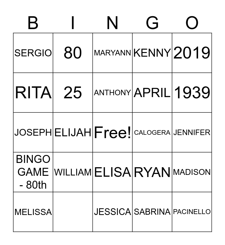 This bingo card has a free space and 25 words: BINGO GAME - 80th, CAROLE, CALOGERA, PACINELLO, SERGIO, 80, MARYANN, KENNY, JENNIFER, MELISSA, 25, ANTHONY, SABRINA, MADISON, RITA, WILLIAM, JESSICA, APRIL, 1939, JOSEPH, ELIJAH, ELISA, RYAN, 2019 and David.