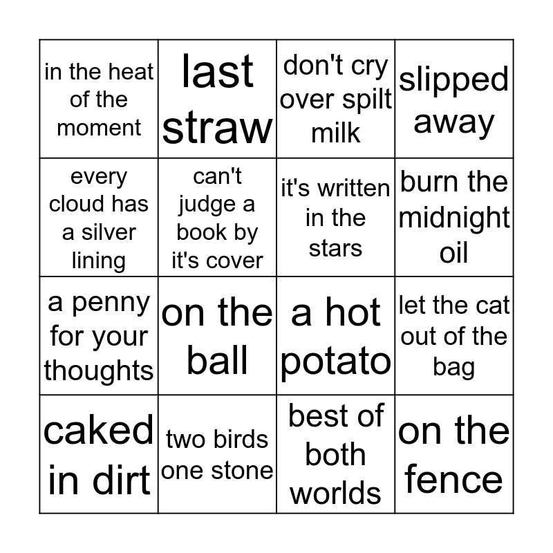 This bingo card has 16 words: two birds one stone, let the cat out of the bag, don't cry over spilt milk, in the heat of the moment, a penny for your thoughts, last straw, a hot potato, best of both worlds, every cloud has a silver lining, can't judge a book by it's cover, caked in dirt, slipped away, on the ball, burn the midnight oil, it's written in the stars and on the fence.