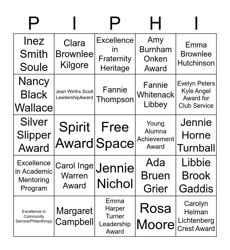 This bingo card has a free space and 26 words: Jennie Nichol, Rosa Moore, Fannie Thompson, Margaret Campbell, Emma Brownlee Hutchinson, Inez Smith Soule, Nancy Black Wallace, Clara Brownlee Kilgore, Jennie Horne Turnball, Ada Bruen Grier, Fannie Whitenack Libbey, Silver Slipper Award, Libbie Brook Gaddis, Excellence in Community Service/Philanthropy, Spirit Award, Balfour Cup Award, Amy Burnham Onken Award, Excellence in Academic Mentoring Program, Excellence in Fraternity Heritage, Carolyn Helman Lichtenberg Crest Award, Evelyn Peters Kyle Angel Award for Club Service, Emma Harper Turner Leadership Award, Young Alumna Achievement Award, Carol Inge Warren Award, Jean Wirths Scott LeadershipAward and Chapter Service Award.