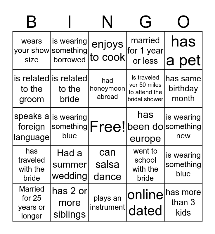 This bingo card has a free space and 24 words: Had a summer wedding, has 2 or more siblings, had honeymoon abroad, Married for 25 years or longer, has a pet, wears your show size, is related to the groom, is wearing something borrowed, has been do europe, can salsa dance, is traveled ver 50 miles to attend the bridal shower, speaks a foreign language, went to school with the bride, is wearing something blue, is related to the bride, online dated, is wearing something new, enjoys to cook, has same birthday month, is wearing something blue, has more than 3 kids, has traveled with the bride, married for 1 year or less and plays an instrument.