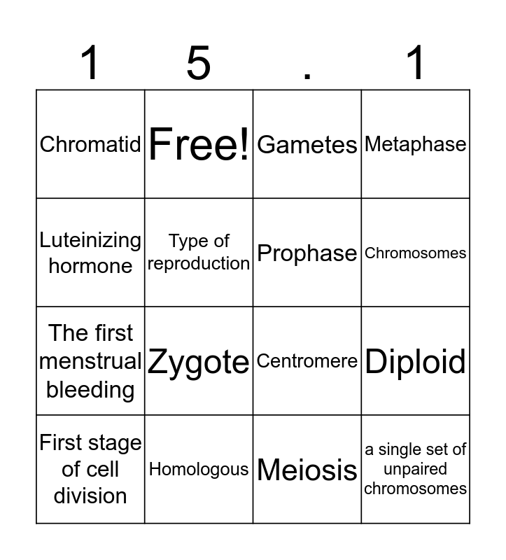 This bingo card has 19 words: Centromere, Follicle-stimulating hormone, Gametes, a single set of unpaired chromosomes, Diploid, Luteinizing hormone, Meiosis, Chromatid, Free!, The first menstrual bleeding, Zygote, Type of reproduction, Prophase, Homologous, First stage of cell division, Fertilization, Metaphase, Chromosomes and Crossovers.