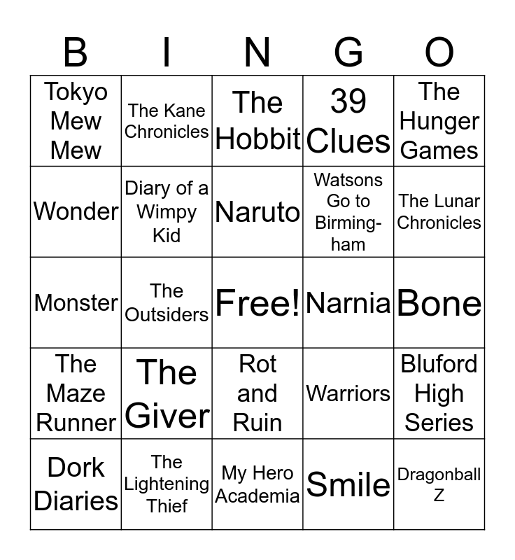 This bingo card has a free space and 24 words: The Giver, The Lightening Thief, Naruto, Dork Diaries, The Hunger Games, Tokyo Mew Mew, Wonder, The Kane Chronicles, Narnia, Rot and Ruin, Watsons Go to Birming-ham, Monster, Warriors, Bluford High Series, Diary of a Wimpy Kid, Smile, Bone, The Hobbit, The Lunar Chronicles, The Outsiders, Dragonball Z, The Maze Runner, 39 Clues and My Hero Academia.