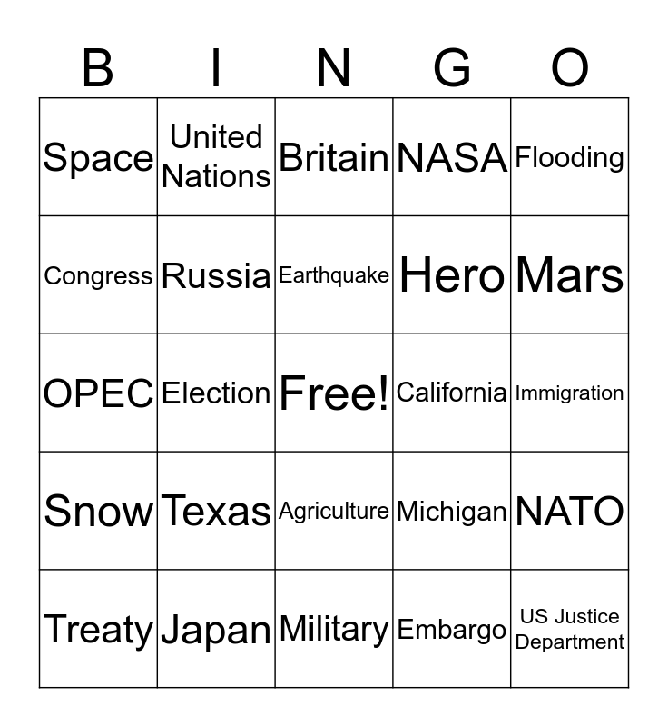 This bingo card has a free space and 39 words: North Korea, President Trump, Supreme Court, Russia, Treaty, Agriculture, Earthquake, Tornado, Flooding, Snow, Election, NASA, US Justice Department, Immigration, California, Texas, Florida, Space, The Constitution, Michigan, Congress, Military, Hero, Mars, Jupiter, China, Canada, Mexico, India, United Nations, Prime Minister, European Union, Britain, Japan, Embargo, Iran, NATO, OPEC and Colorado.