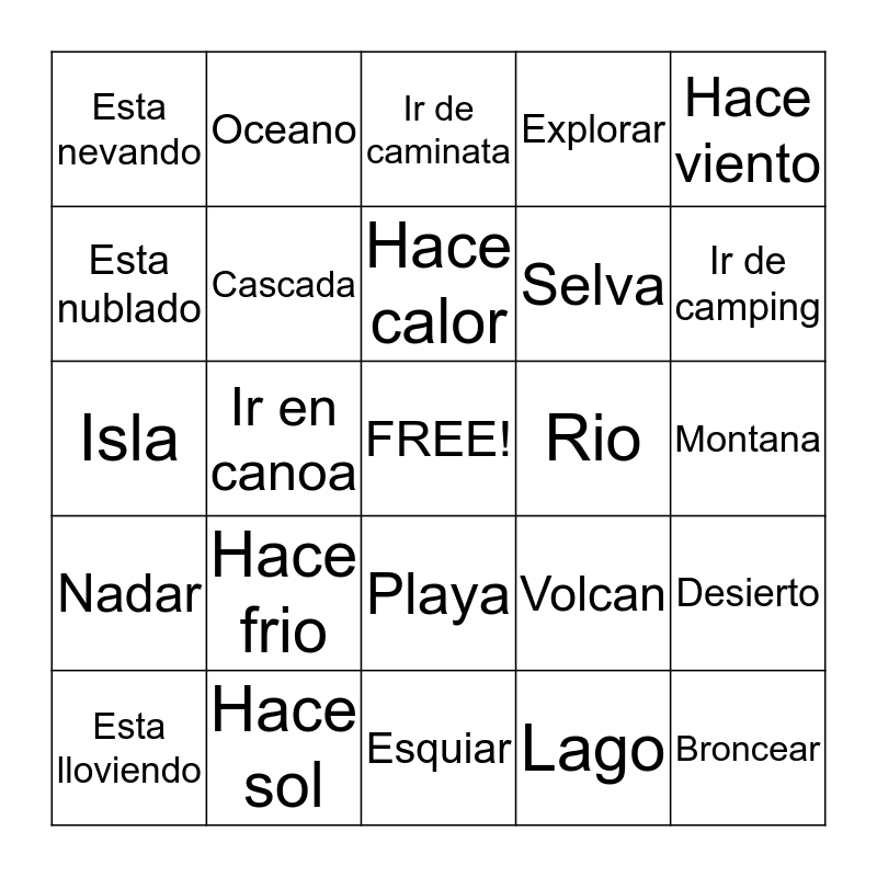 This bingo card has a free space and 24 words: Hace frio, Hace sol, Hace calor, Esta lloviendo, Hace viento, Esta nevando, Esta nublado, Oceano, Rio, Playa, Selva, Isla, Volcan, Desierto, Cascada, Lago, Montana, Ir de caminata, Ir de camping, Ir en canoa, Broncear, Nadar, Explorar and Esquiar.