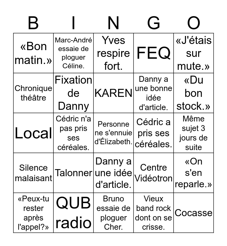 This bingo card has a free space and 24 words: «Peux-tu rester après l'appel?», Talonner, KAREN, Vieux band rock dont on se crisse., «J'étais sur mute.», «Bon matin.», Marc-André essaie de ploguer Céline., Yves respire fort., Cédric a pris ses céréales., Même sujet 3 jours de suite, Local, Fixation de Danny, Centre Vidéotron, «On s'en reparle.», Chronique théâtre, QUB radio, Bruno essaie de ploguer Cher., FEQ, «Du bon stock.», Silence malaisant, Cédric n'a pas pris ses céréales., Danny a une idée d'article., Danny a une bonne idée d'article. and Cocasse.
