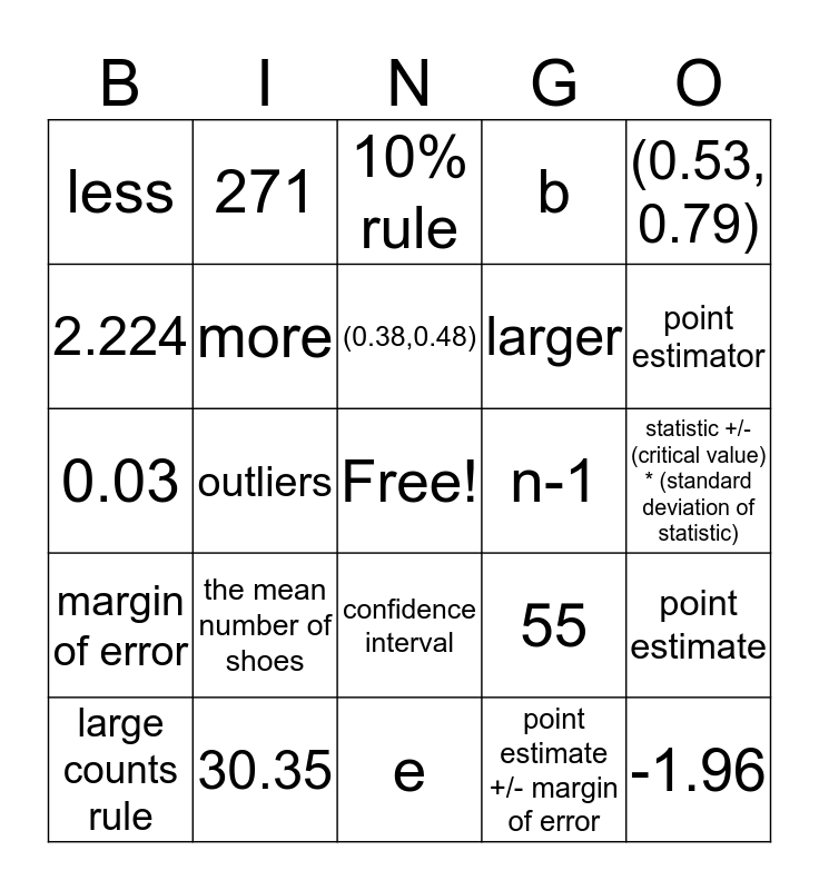 This bingo card has a free space and 24 words: the mean number of shoes, 30.35, (0.38,0.48), large counts rule, (0.53, 0.79), less, 2.224, 271, n-1, confidence interval, larger, 0.03, 55, point estimate, more, point estimate +/- margin of error, statistic +/- (critical value) * (standard deviation of statistic), 10% rule, point estimator, outliers, -1.96, margin of error, b and e.