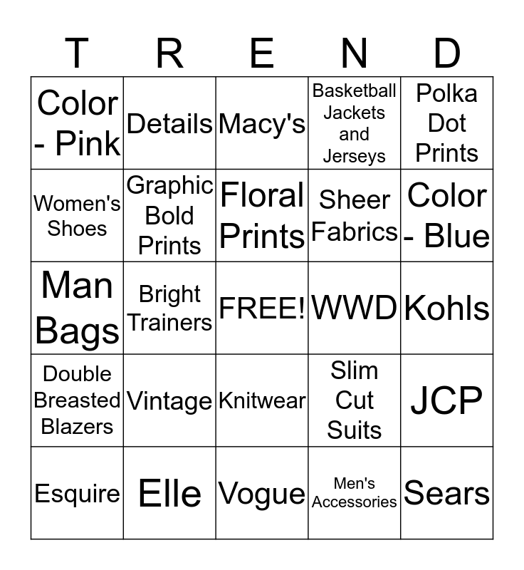 This bingo card has a free space and 36 words: Muted tones w/ orange, red, and yellow accents, Streetwear and Activewear, Technical Fabrics, Graphic Bold Prints, Slim Cut Suits, Double Breasted Blazers, Floral Prints, Tropical Prints, Polka Dot Prints, Camo, Bright Trainers, Basketball Jackets and Jerseys, Color - Gray, WWD, Color - Blue, Color - Pink, Color - Black/White, Vintage, Sears, Macy's, Kohls, JCP, Elle, Esquire, Vogue, Details, Man Bags, Metallics, Sheer Fabrics, Women's Shoes, Cropped Tops, Embellished Details, Men's Accessories, Knitwear, Men's Shoes and Belk.