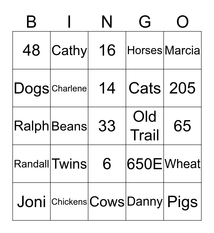 This bingo card has a free space and 34 words: Mike, Danny, Dale, Norm, Randall, Charlene, Marcia, Joni, Cathy, Mary, 14, 16, 5, 17, Old Trail, 205, Chickens, Ralph, Twins, 650E, 6, 11, 48, 65, Cows, Pigs, Horses, Ponies, Cats, Dogs, Corn, Beans, Wheat and Oats.
