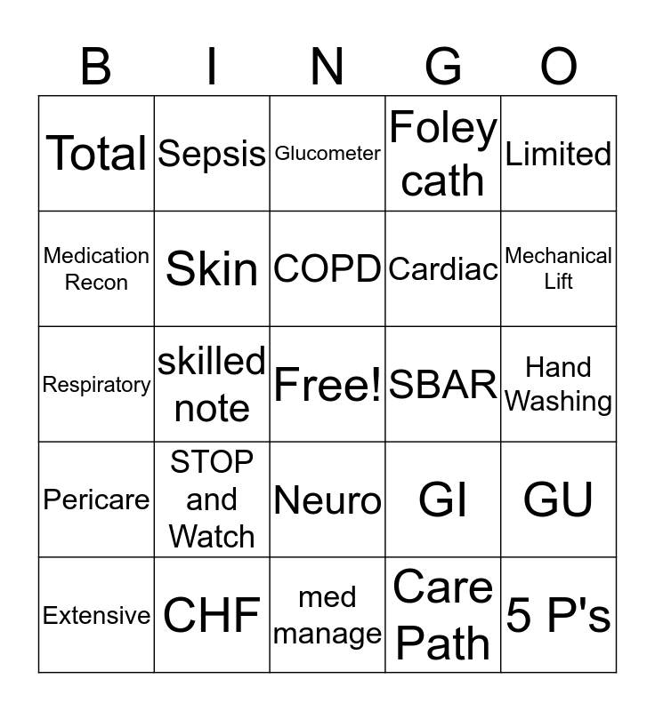 This bingo card has a free space and 24 words: STOP and Watch, CHF, COPD, Extensive, Limited, Total, Medication Recon, Sepsis, SBAR, Neuro, Cardiac, Respiratory, GI, GU, Skin, Care Path, Hand Washing, Glucometer, Mechanical Lift, skilled note, 5 P's, Pericare, Foley cath and med manage.