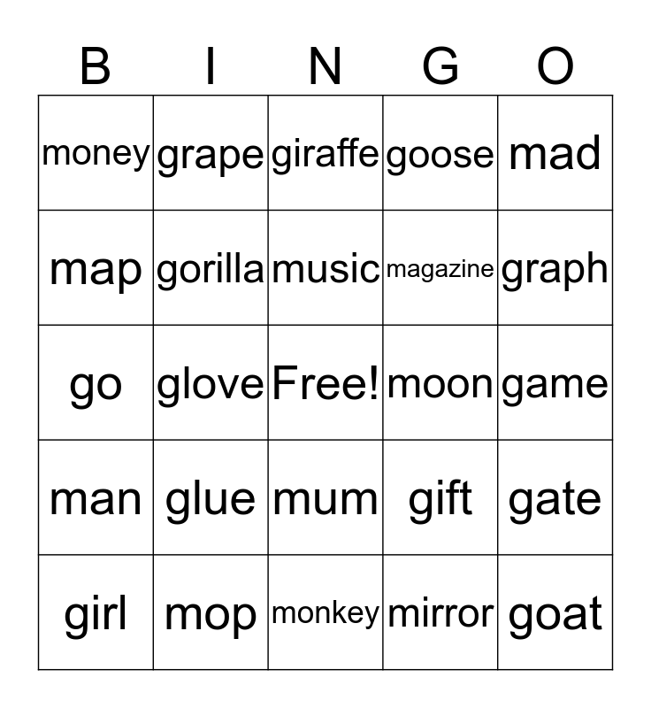 This bingo card has a free space and 29 words: girl, giant, glove, mouse, money, giraffe, gorilla, glue, moon, mop, game, goat, monkey, mirror, graph, gem, mum, man, mad, go, gift, mug, magazine, map, goose, grape, gate, music and mask.