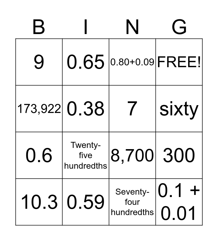 This bingo card has 16 words: 0.59, 300, 0.80+0.09, 9, 0.6, 0.65, 8,700, Seventy-four hundredths, 173,922, 0.38, 10.3, FREE!, Twenty-five hundredths, sixty, 7 and 0.1 + 0.01.