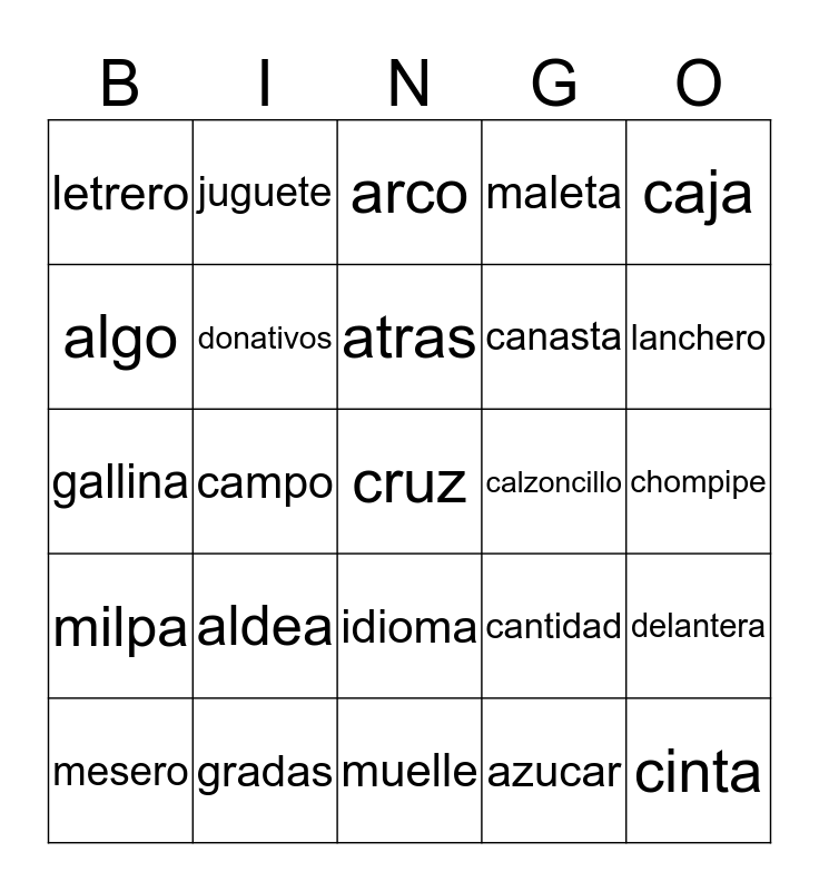 This bingo card has 25 words: aldea, muelle, atras, mesero, caja, letrero, algo, juguete, calzoncillo, idioma, canasta, gallina, cantidad, delantera, donativos, cinta, chompipe, arco, lanchero, campo, cruz, gradas, milpa, maleta and azucar.