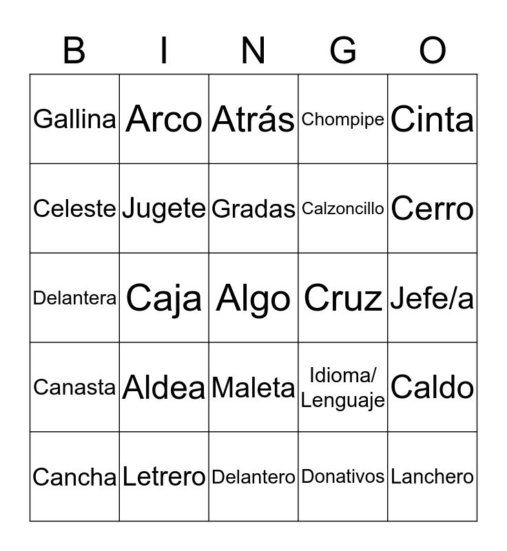 This bingo card has a free space and 24 words: Aldea, Letrero, Gradas, Cancha, Cinta, Gallina, Celeste, Arco, Cruz, Maleta, Calzoncillo, Delantera, Idioma/ Lenguaje, Caldo, Jugete, Donativos, Jefe/a, Atrás, Cerro, Caja, Lanchero, Canasta, Chompipe and Delantero.