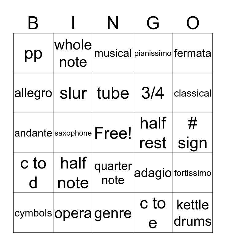This bingo card has a free space and 24 words: half note, opera, tube, cymbols, fermata, pp, allegro, whole note, half rest, quarter note, 3/4, andante, adagio, fortissimo, slur, c to e, # sign, musical, classical, saxophone, kettle drums, c to d, pianissimo and genre.