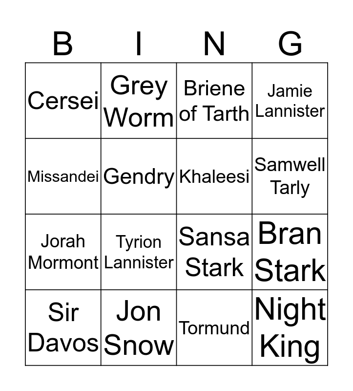 This bingo card has 16 words: Jon Snow, Bran Stark, Briene of Tarth, Cersei, Jorah Mormont, Grey Worm, Sansa Stark, Tormund, Missandei, Gendry, Sir Davos, Jamie Lannister, Tyrion Lannister, Samwell Tarly, Khaleesi and Night King.