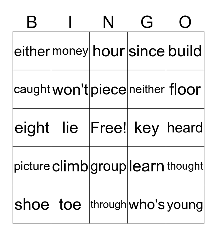 This bingo card has a free space and 34 words: move, who's, whole, beautiful, picture, won't, build, shoe, money, buy, piece, hour, month, door, key, floor, toe, eight, climb, learn, group, bought, either, heard, through, young, since, enough, neither, caught, earth, lie, thought and built.