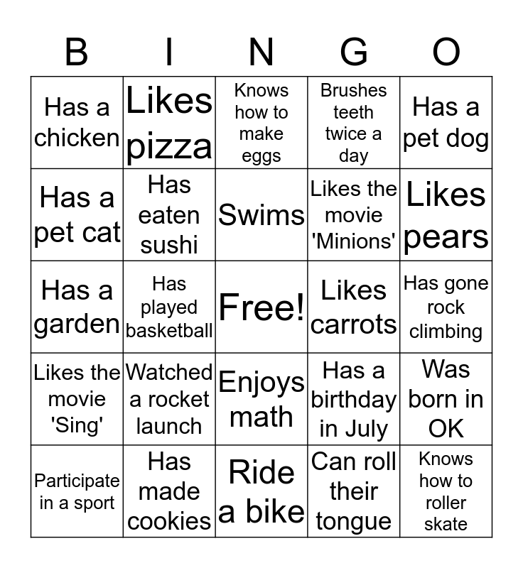 This bingo card has a free space and 25 words: Watched a rocket launch, Ride a bike, Swims, Participate in a sport, Has a pet dog, Has a chicken, Has a pet cat, Likes pizza, Likes carrots, Enjoys math, Likes the movie 'Minions', Has a garden, Has a birthday in July, Was born in OK, Has eaten sushi, Has made a cake before, Has gone rock climbing, Knows how to make eggs, Likes pears, Has played basketball, Knows how to roller skate, Has made cookies, Likes the movie 'Sing', Brushes teeth twice a day and Can roll their tongue.