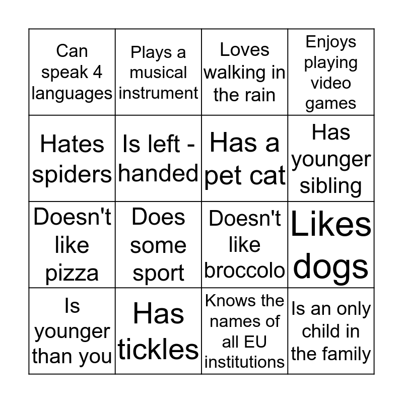This bingo card has 16 words: Has tickles, Likes dogs, Loves walking in the rain, Can speak 4 languages, Doesn't like pizza, Plays a musical instrument, Doesn't like broccolo, Knows the names of all EU institutions, Hates spiders, Is left -handed, Is younger than you, Enjoys playing video games, Does some sport, Has younger sibling, Has a pet cat and Is an only child in the family.