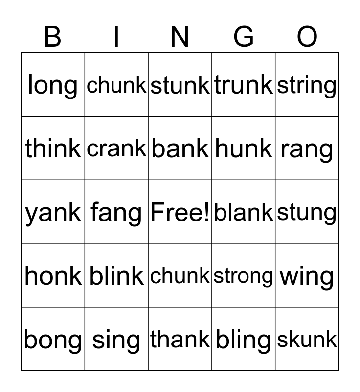 This bingo card has a free space and 24 words: blink, sing, bank, bong, string, long, think, chunk, blank, chunk, hunk, yank, strong, wing, crank, bling, stung, stunk, rang, fang, skunk, honk, trunk and thank.