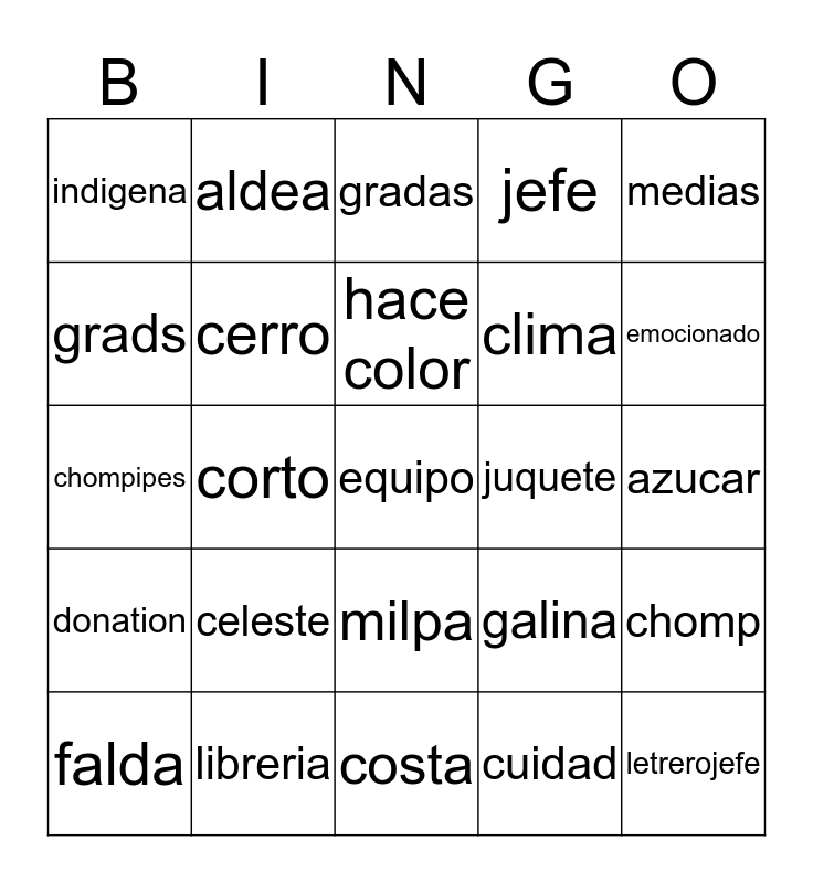 This bingo card has a free space and 24 words: celeste, libreria, hace color, falda, medias, indigena, grads, aldea, juquete, milpa, clima, chompipes, galina, chomp, cerro, cuidad, azucar, gradas, emocionado, corto, letrerojefe, donation, jefe and costa.