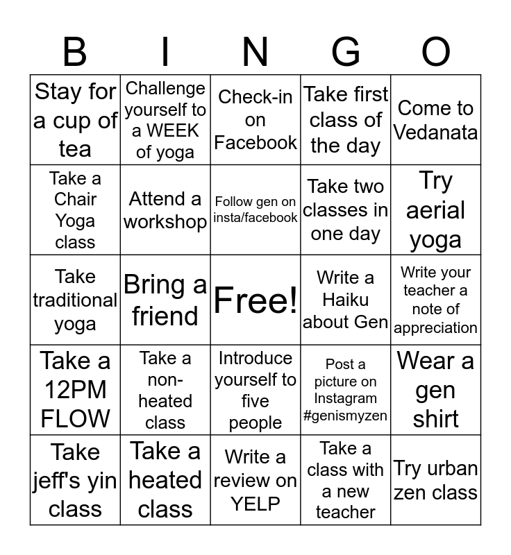 This bingo card has a free space and 25 words: Take a 12PM FLOW, Take a heated class, Write a review on YELP, Take a class with a new teacher, Come to Vedanata, Stay for a cup of tea, Challenge yourself to a WEEK of yoga, Check-in on Facebook, Write a Haiku about Gen, Wear a gen shirt, Take a Chair Yoga class, Attend a workshop, Take a strength class, Post a picture on Instagram #genismyzen, Try aerial yoga, Take jeff's yin class, Bring a friend, Follow gen on insta/facebook, Take two classes in one day, Write your teacher a note of appreciation, Take traditional yoga, Take a non-heated class, Introduce yourself to five people, Take first class of the day and Try urban zen class.