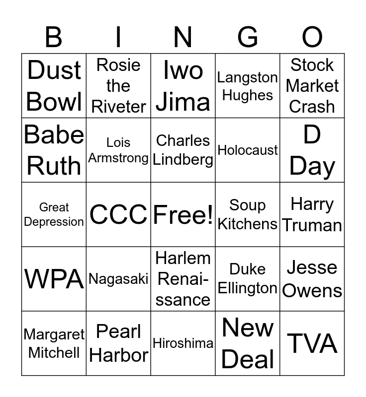This bingo card has a free space and 35 words: Lusitania, Treaty of Versailles, Jazz Age, Lois Armstrong, Harlem Renai-ssance, Langston Hughes, Babe Ruth, Henry Ford, Charles Lindberg, World War I, Great Depression, Stock Market Crash, Herbert Hoover, FDR, Dust Bowl, Soup Kitchens, New Deal, CCC, WPA, TVA, Duke Ellington, Margaret Mitchell, Jesse Owens, Pearl Harbor, Iwo Jima, D Day, VE Day, VJ Day, Holocaust, Harry Truman, Tuskegee Airmen, Hiroshima, Nagasaki, Rosie the Riveter and Rationing.
