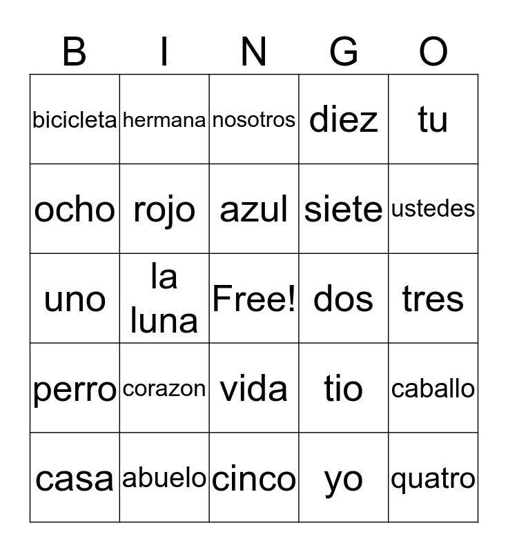 This bingo card has a free space and 34 words: madre, yo, pajaro, gato, perro, rojo, tu, casa, hermana, padre, azul, nosotros, verde, manzana, dos, ustedes, abuelo, uno, corazon, tio, vida, nina, bicicleta, tres, cinco, quatro, diez, nueve, siete, ocho, el sol, la luna, caballo and la puerta.