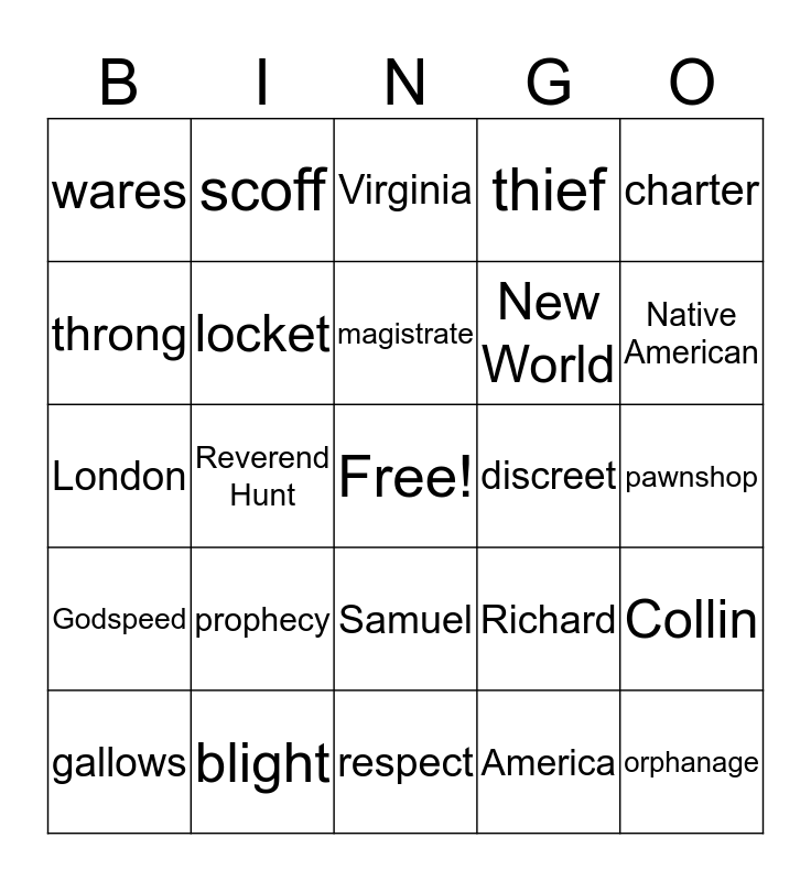 This bingo card has a free space and 24 words: prophecy, blight, magistrate, gallows, charter, wares, throng, scoff, discreet, Samuel, New World, London, Richard, Collin, locket, America, pawnshop, Virginia, Native American, Reverend Hunt, orphanage, Godspeed, thief and respect.