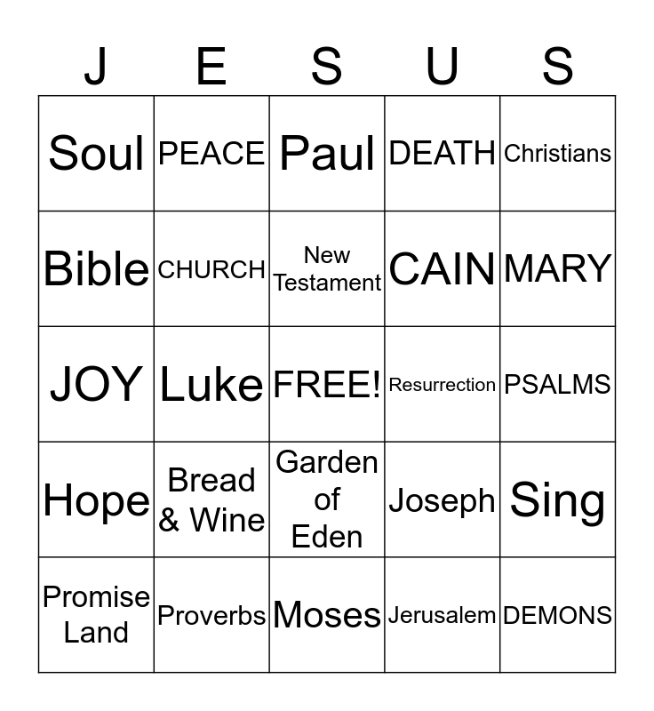 This bingo card has a free space and 75 words: Bride, Hebrews, Paul, Faith, Abraham, reign, gospel, WITNESS, SATAN, sacrifice, blessed, shepherd, New Testament, Bible, Crucified, Luke, JEWS, DEMONS, eternal, Christians, VICTORY, JOY, CHURCH, PEACE, DEATH, ANGELS, EVIL, SERVE, MESSIAH, TRUST, JUSTICE, GENTILES, PAUL, Joseph, MARY, CAIN, SPIRIT, SINNER, PSALMS, Jerusalem, Scripture, righteous, LIFE, Thankful, Cripple, Prophets, Promise Land, Soul, Worship, Tithes & Offering, Jews, Garden of Eden, Red Sea, Glory, Fishermen, Power, Noah, Flood, Self-control, Ark, Bread & Wine, Daniel, Blood, Saved, Children, Resurrection, Grace & Mercy, Delieve, Romans, Sing, Hope, Proverbs, Healer, Moses and Timothy.