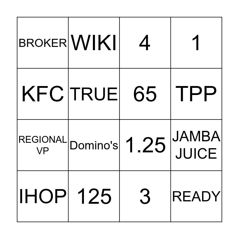 This bingo card has 21 words: 125, CAPTIVE, WIKI, RPC, 3, 65, BROKER, 4, 1.25, TPP, REGIONAL VP, 1, READY, FALSE, TRUE, Dennys, IHOP, Domino's, KFC, JAMBA JUICE and SONIC.