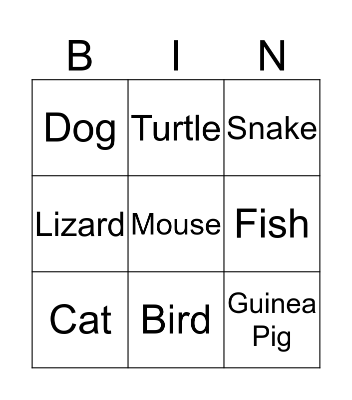 This bingo card has 9 words: Cat, Mouse, Snake, Dog, Turtle, Fish, Lizard, Bird and Guinea Pig.