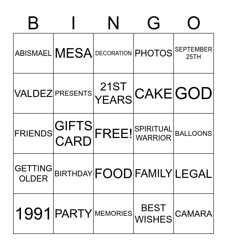 This bingo card has a free space and 24 words: BIRTHDAY, PARTY, 21ST YEARS, 1991, SEPTEMBER 25TH, ABISMAEL, VALDEZ, MESA, SPIRITUAL WARRIOR, FOOD, CAKE, FRIENDS, FAMILY, LEGAL, PRESENTS, BEST WISHES, BALLOONS, DECORATION, GOD, GIFTS CARD, CAMARA, GETTING OLDER, PHOTOS and MEMORIES.