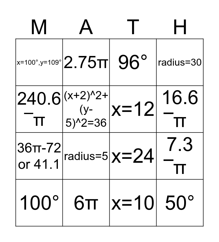 This bingo card has 26 words: Free!, 19.25π, 16.6 ̅π, x=2, 240.6 ̅π, x=100°,y=109°, (x+2)^2+(y-5)^2=36, 2.75π, x=10, x=14, 36π-72 or 41.1, x=24, 8.8 ̅π, 51°, 7.3 ̅π, x=4, radius=30, 50°, 96°, 100°, radius=5, 25π-50 or 25.5, 6π, x=1, x=12 and 12π.