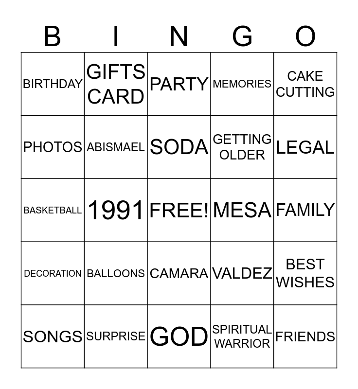 This bingo card has a free space and 31 words: GOD, SEPTEMBER 25TH, 1991, 21ST YEARS, BIRTHDAY, PARTY, ABISMAEL, VALDEZ, MESA, SPIRITUAL WARRIOR, FAMILY, FRIENDS, FOOD, CAKE, LEGAL, PRESENTS, BEST WISHES, BALLOONS, DECORATION, CAMARA, CAKE CUTTING, FUN, SONGS, GIFTS CARD, GETTING OLDER, PHOTOS, MEMORIES, BASKETBALL, SURPRISE, SODA and JUICE.