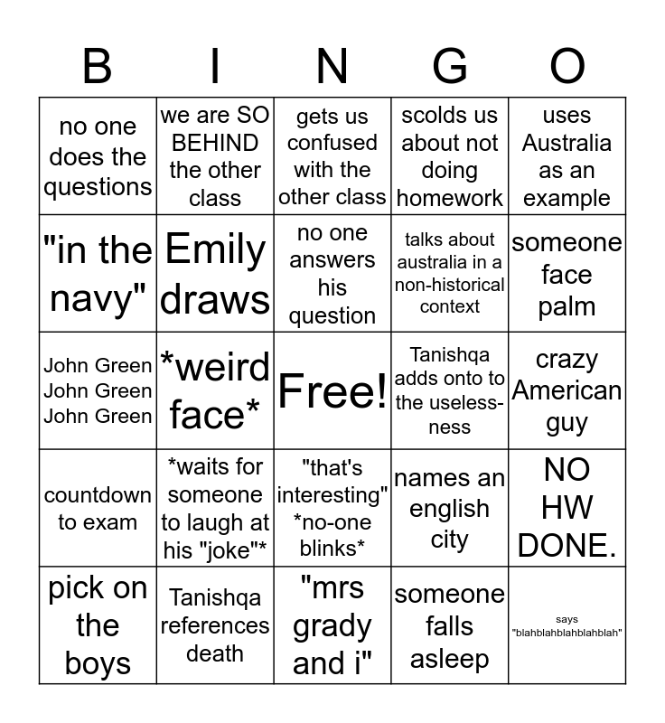 This bingo card has a free space and 27 words: names an english city, "what did we do last lesson?", talks about australia in a non-historical context, "mrs grady and i", "in the navy", gets us confused with the other class, we are SO BEHIND the other class, countdown to exam, Tanishqa adds onto to the useless-ness, NO HW DONE., John Green John Green John Green, scolds us about not doing homework, pick on the boys, Tanishqa references death, someone face palm, someone rolls their eyes, Emily draws, no one answers his question, *waits for someone to laugh at his "joke"*, no one does the questions, crazy American guy, someone falls asleep, *weird face*, says "blahblahblahblahblah", "that's interesting" *no-one blinks*, uses Australia as an example and compares England to Australia.