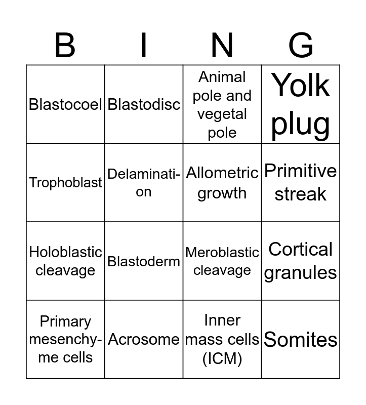 This bingo card has 16 words: Acrosome, Cortical granules, Animal pole and vegetal pole, Blastocoel, Holoblastic cleavage, Blastodisc, Meroblastic cleavage, Inner mass cells (ICM), Trophoblast, Delaminati-on, Primary mesenchy-me cells, Yolk plug, Blastoderm, Primitive streak, Allometric growth and Somites.