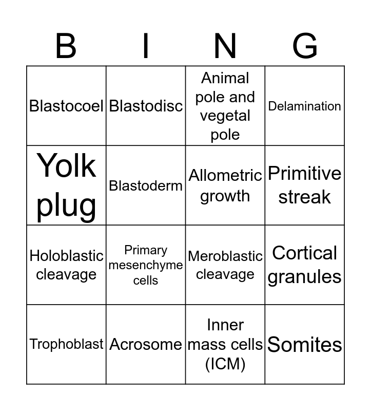 This bingo card has 16 words: Acrosome, Cortical granules, Animal pole and vegetal pole, Blastocoel, Holoblastic cleavage, Blastodisc, Meroblastic cleavage, Inner mass cells (ICM), Yolk plug, Blastoderm, Trophoblast, Delamination, Primary mesenchyme cells, Primitive streak, Allometric growth and Somites.