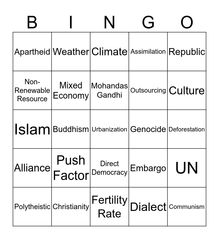 This bingo card has 101 words: FREE!, Globalization, Republic, Climate, Tsunami, Monsoon, Arable, Arid, Immigration, Emigration, Nomad, Pandemic, Divine Right, Absolute Monarchy, Theocracy, Cultural Convergence, Alliance, Nationalism, Totalitarian System, Erosion, Urban, Rural, Population Density, Standard of Living, Gross Domestic Product (GDP), Culture, Assimilation, Push Factor, El Nino, Indigenous, Weather, Climate, Pull Factor, Absolute Monarch, Constitutional Monarchy, Direct Democracy, Representative Democracy, Monotheistic, Dialect, Fertility Rate, Carrying Capacity, Polytheistic, Nation, Overpopulation, Subsistence Activity, Urbanization, Industrial Revolution, Market Economy, Dictatorship, Communism, Per Capita Income, Non-Renewable Resource, Natural Boundaries, Political Boundaries, Cultural Diffusion, Rain Shadow, Infrastructure, Command Economy, Berlin Conference, Traditional Economy, Mixed Economy, Caste System, Reincarnation, Dharma, Karma, Outsourcing, Hinduism, Buddhism, Christianity, Judaism, Raj, Nonviolent Resistance, Apartheid, Nelson Mandela, Mohandas Gandhi, Islam, Cash Crop, Supply and Demand, Cottage Industry, Ring of Fire, Desalinization, Refugee, Genocide, Berlin Conference, Colonialism, Desertification, Deforestation, Drought, European Union, NAFTA, Embargo, Commodity, Famine, Irrigation, NATO, UN, Patriotism, Cold War, OPEC, Stateless Nation and Hydroelectric Power.