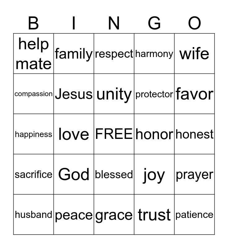 This bingo card has a free space and 24 words: God, peace, unity, husband, wife, help mate, compassion, family, honor, blessed, protector, happiness, joy, prayer, Jesus, trust, honest, respect, favor, love, patience, sacrifice, harmony and grace.