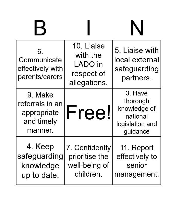 This bingo card has a free space and 11 words: 1. Principle responsibility for safeguarding, welfare and child protection, 2. Must attend DSL training every 2 years, 3. Have thorough knowledge of national legislation and guidance, 4. Keep safeguarding knowledge up to date., 5. Liaise with local external safeguarding partners., 6. Communicate effectively with parents/carers, 7. Confidently prioritise the well-being of children., 8. Make referrals to Social Care, MASH or the police., 9. Make referrals in an appropriate and timely manner., 10. Liaise with the LADO in respect of allegations. and 11. Report effectively to senior management..