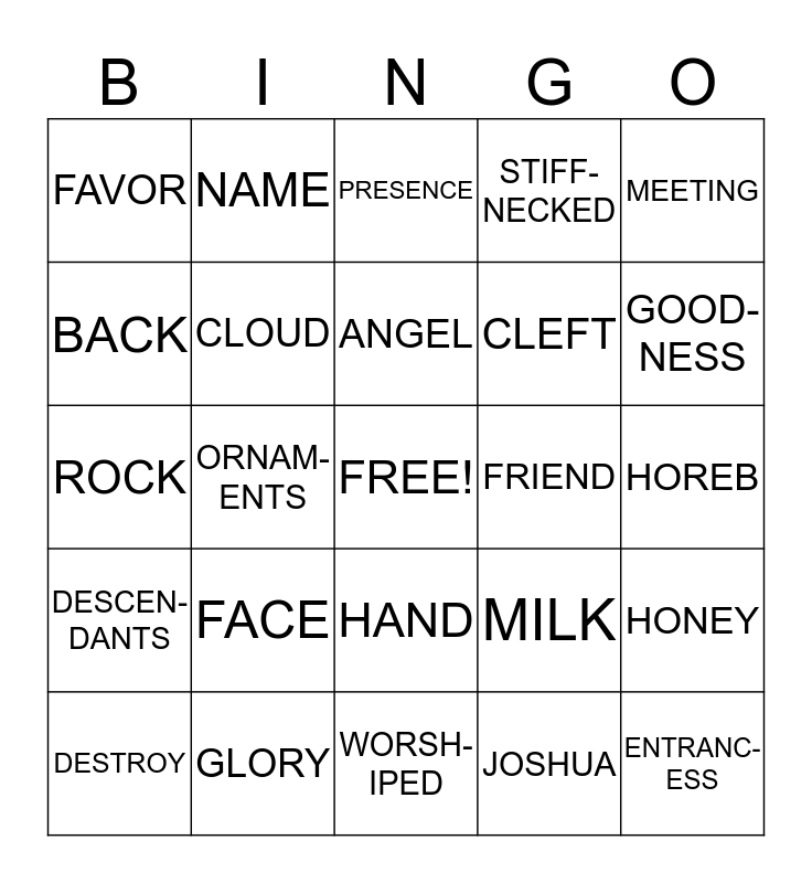 This bingo card has a free space and 24 words: FACE, GLORY, ANGEL, DESTROY, MEETING, FAVOR, BACK, NAME, FRIEND, HAND, CLEFT, ROCK, MILK, HONEY, CLOUD, JOSHUA, HOREB, PRESENCE, GOOD-NESS, ORNAM-ENTS, ENTRANC-ESS, DESCEN-DANTS, STIFF-NECKED and WORSH-IPED.